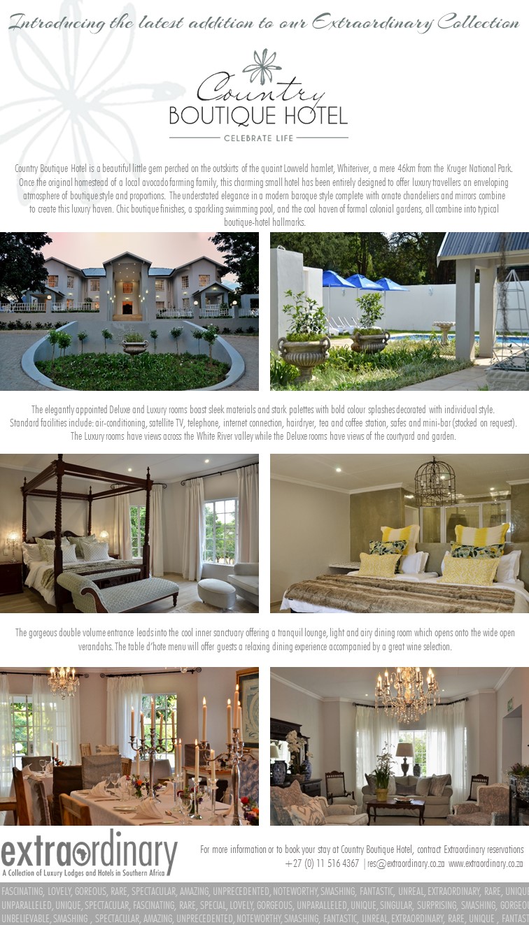 Country Boutique Hotel is part of the Extraordinary Collection of lodges and hotels in Southern Africa. For more information, contact Ms. Cindy Walker of Extraordinary on Tel: +27 011 516 4367, Email [email protected]