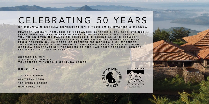 Join us in the celebrations in New York City, 23rd August 2017, when Praveen Moman (Founder of Volcanoes Safaris) & Dr. Tara Stoinski (President of Dian Fossey Gorilla Fund International) invite you to an evening panel to discuss the essential link between Mountain Gorilla conservation, tourism, and communities.