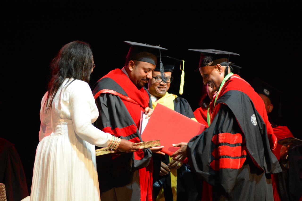 Guest of Honor of the ceremony H.E. Dr Abiy Ahmed, Prime Minister of Ethiopia, hooded and handed over the Degree to Mr. Tewolde GebreMariam in recognition and honor of his remarkable achievements in the growth and expansion of Ethiopian Airlines.
