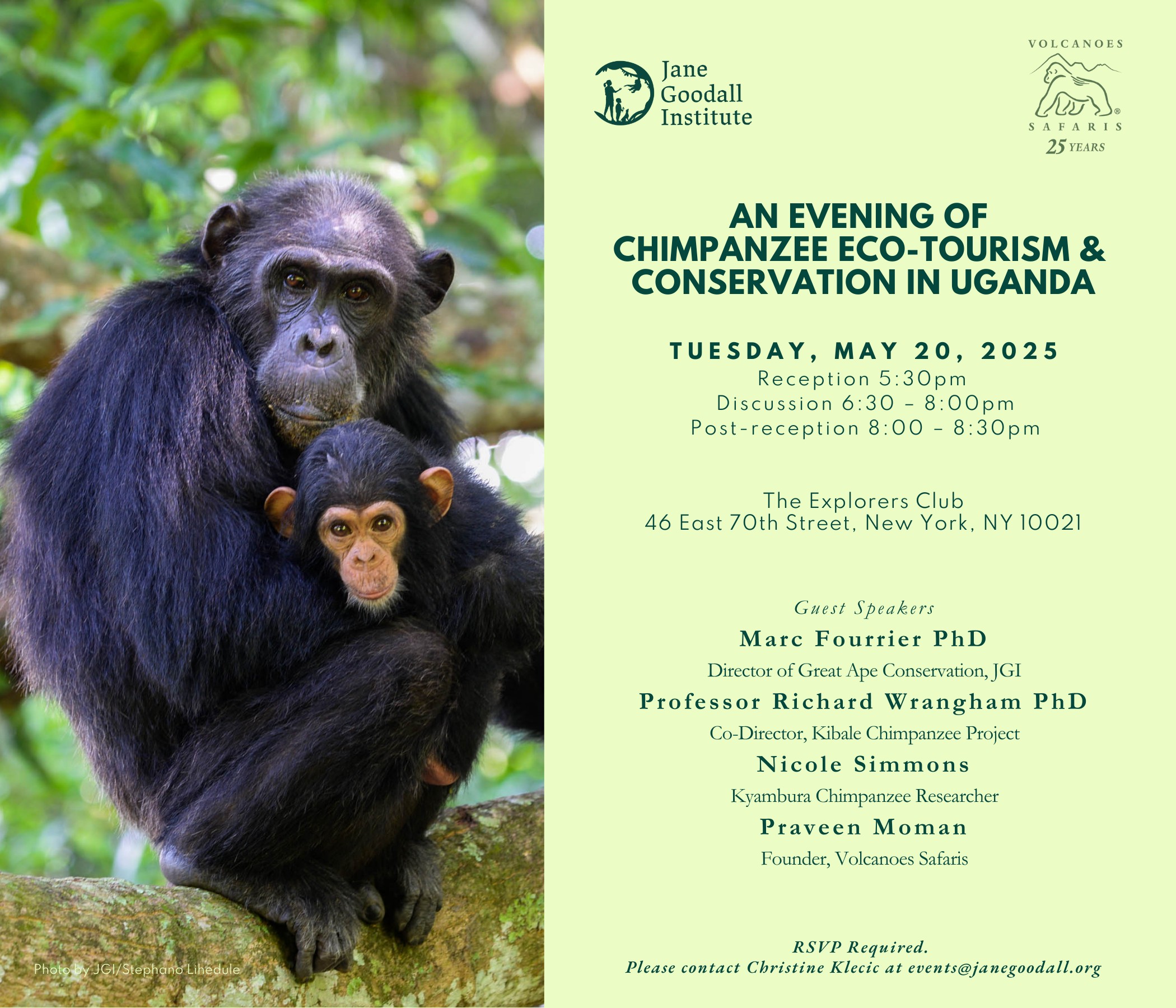 Please join us for a cocktail reception followed by a discussion on conservation of chimpanzees through ecotourism and community engagement with Volcanoes Safaris and the Jane Goodall Institute.