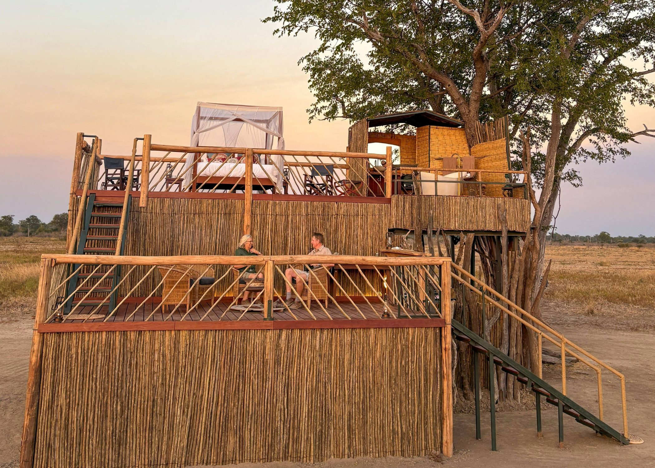 - Upper Deck: The centrepiece – a beautifully appointed four-poster bed draped in a large mosquito net, warmed by soft duvets and lanterns. Added luxuries include a plumbed toilet, vanity, and a freestanding outdoor bathtub – perfect for soaking under the stars while gazing over the sweeping savannah.